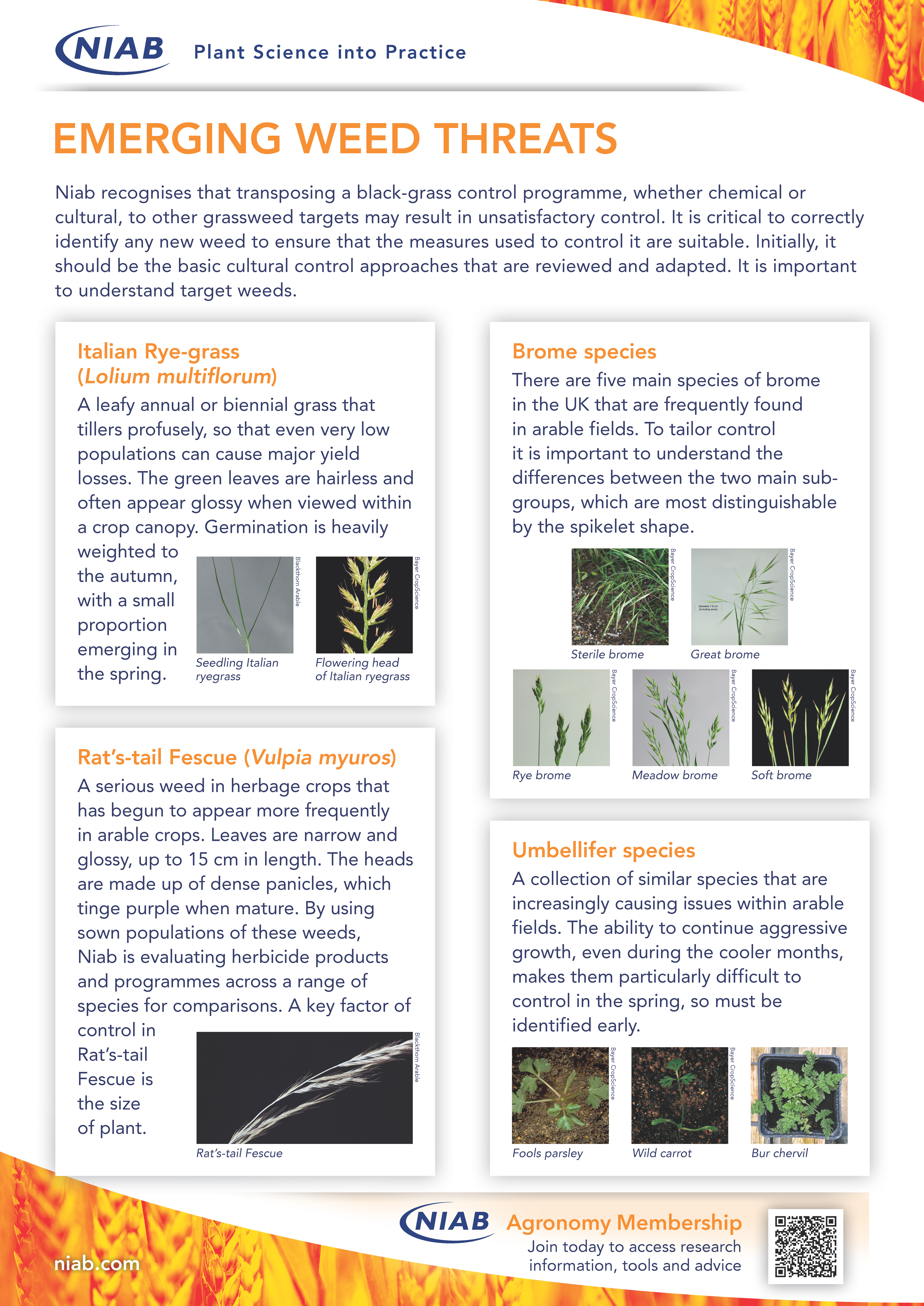 View our grass weed research and management information posters, usually seen at our open days and the Cereals Event stand. An update to our 2022 poster summarising Niab's research and advice on emerging weed threats of Italian ryegrass, Rat's tail fescue, and Umbellifer species alongside the growing threat of brome.