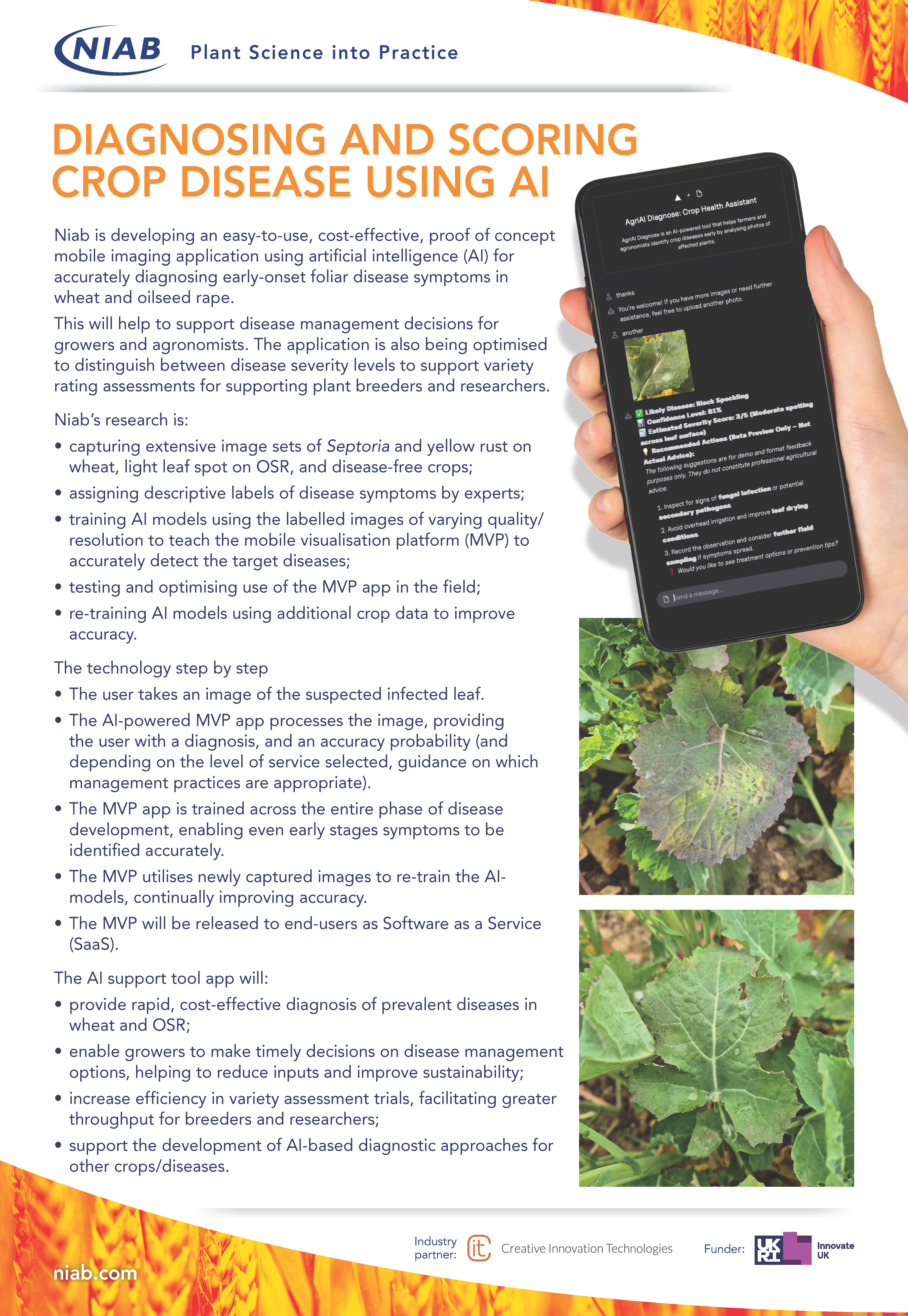 This poster was shown at the 2025 Niab Open Days, Cereals Event and Groundswell and summarises Niab's work in using artificial intelligence for diagnosing foliar disease in wheat and oilseed rape.