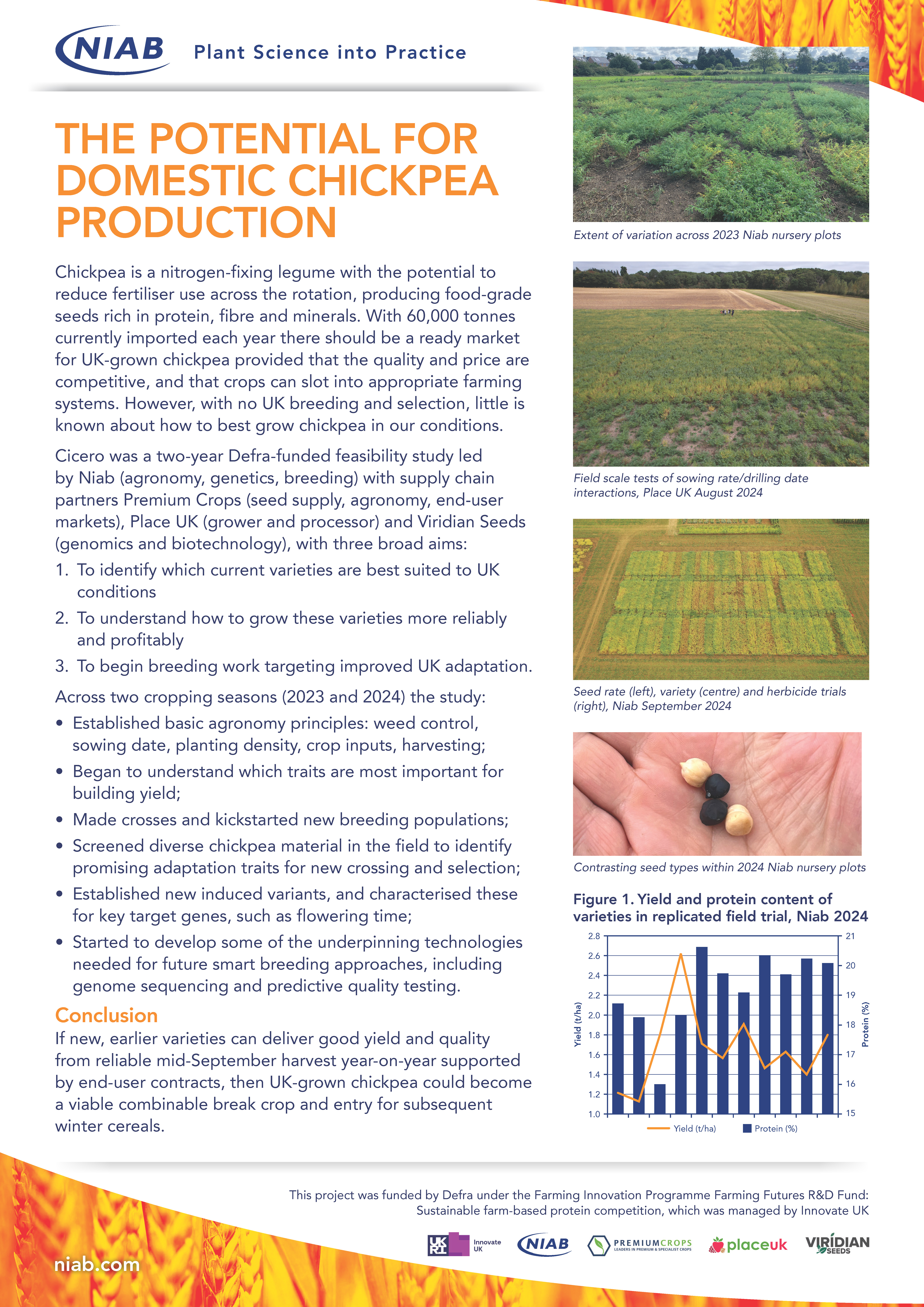 Used at the 2025 Cereals Event and Groundswell shows this poster explores the potential for domestic chickpea production and summarises the Cicero project, a two-year Defra-funded feasibility study led by Niab with supply chain partners Premium Crops, Place UK and Viridian Seeds.