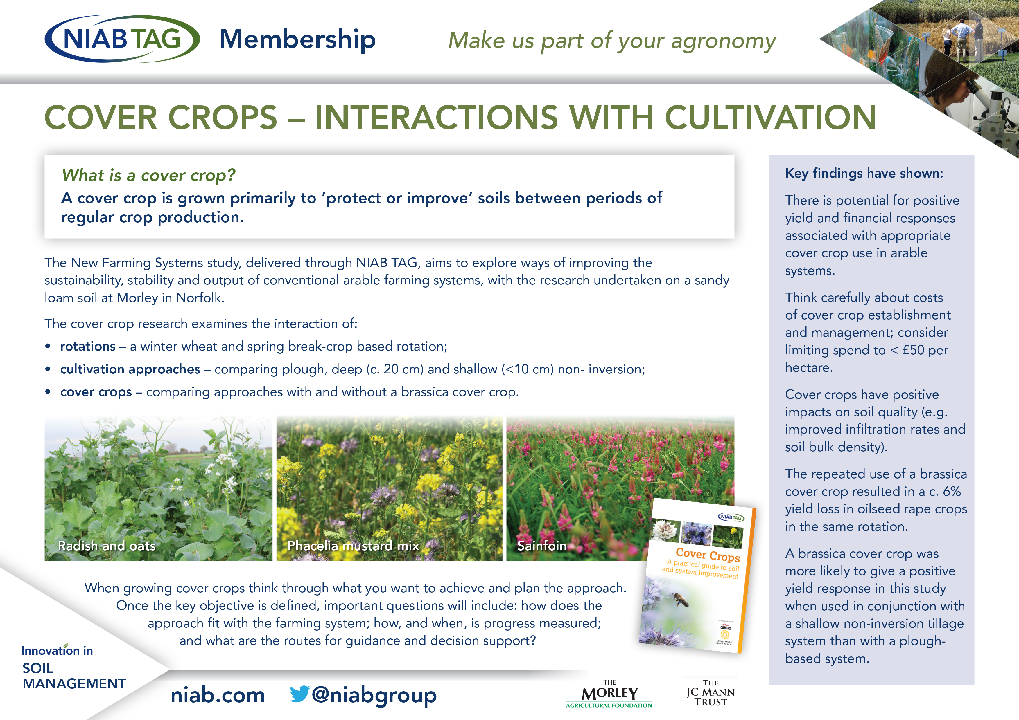 Download our information flyers on cover crops, usually seen as poster boards around our open days and the Cereals Event stand. This year NIAB's Farming Systems team has summarised the latest research and advice on the use of cover crops, including crop choice and interaction with cultivations and rotation