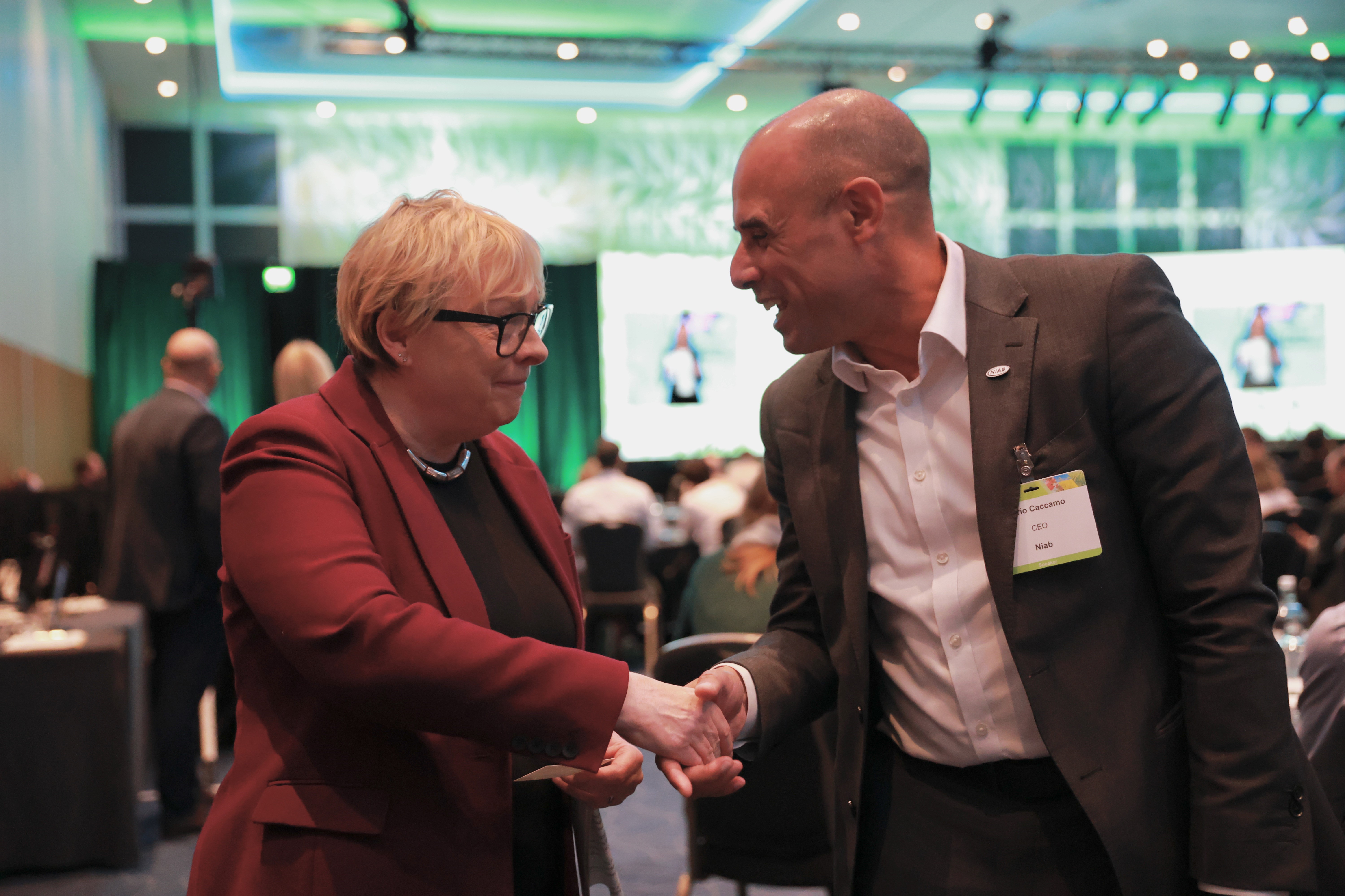 Niab CEO Mario Caccamo meeting new Minister of State for Food Security and Rural Affairs Dame Angela Eagle DBE at an industry event in early October 2025. (Photo by Max MacGillivray)